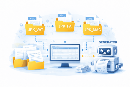 System umożliwia eksport danych do plików XML, zgodnych z Jednolitym Plikiem Kontrolnym. Współpracuje z programem GENERATOR firmy ProComp. Obejmuje następujace elementy: